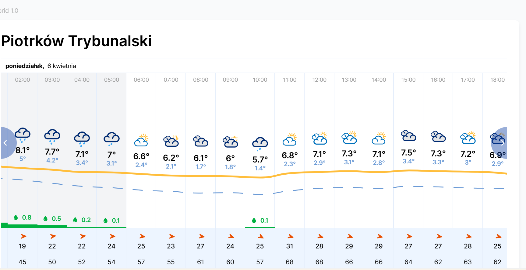 W poniedziałek zachmurzenie małe i umiarkowane, okresami duże. Miejscami przelotne opady deszczu, początkowo na północy i północnym wschodzie deszczu ze śniegiem lub krupy śnieżnej. Wysoko w Beskidach i Tatrach opady śniegu. Temperatura maksymalna od 7 st. C, 8 st. C na północy oraz Podhalu do 10 st. C, 11 st. C w centrum i na zachodzie oraz 12 st. C miejscami na południu. Wiatr umiarkowany i dość silny, w porywach do 65 km/h, północno-zachodni i zachodni. Nad morzem wiatr silny i bardzo silny, do 50 km/h, w porywach do 85 km/h, zachodni. Wysoko w Sudetach porywy wiatru do 75 km/h, na szczytach Tatr do 80 km/h i tam wiatr powodował będzie zamiecie i zawieje śnieżne.