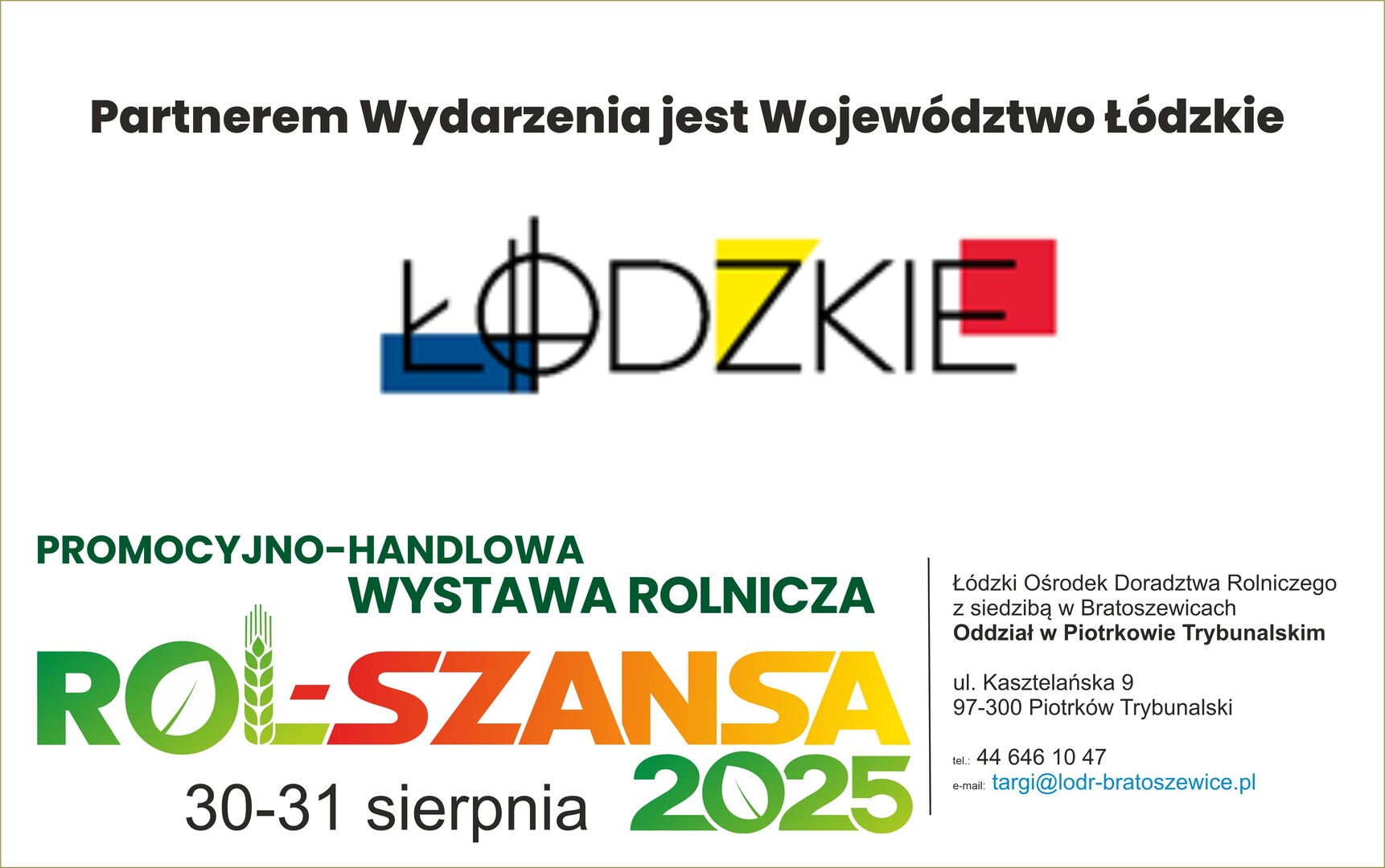 Oddział ŁODR w Piotrkowie Trybunalskim, serdecznie zaprasza na: XXXIII Promocyjno-Handlową Wystawę Rolniczą ROL-SZANSA 2025 już 30 i 31 sierpnia 2025 r. w godz. 8.00–16.00, przy ul. Kasztelańskiej 9, w Piotrkowie Trybunalskim (tereny wystawowe wokół zamku w Bykach)