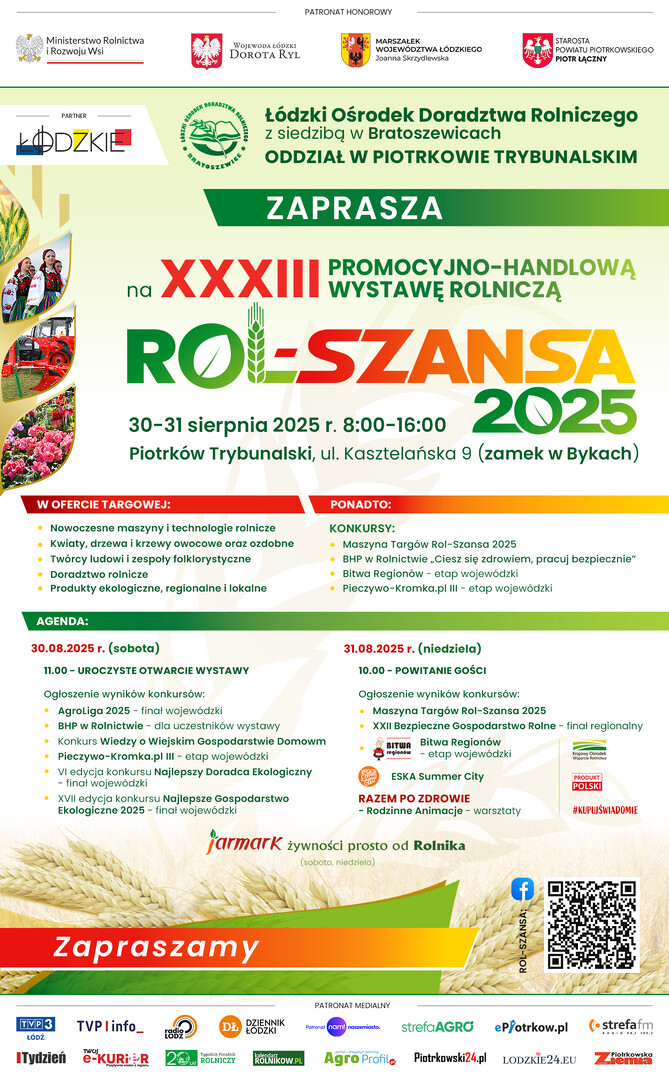 Patronat honorowy: Minister Rolnictwa i Rozwoju Wsi, Wojewoda Łódzki, Marszałek Województwa Łódzkiego, Starosta Powiatu Piotrkowskiego.