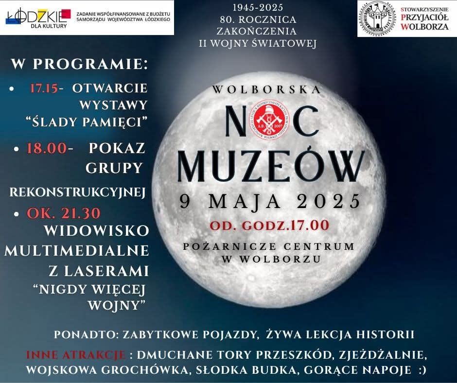 Z okazji 80. rocznicy zakończenia II wojny światowej, już 9 maja 2025 roku, od godziny 17:00 odbędzie się Noc Muzeów w Pożarniczym Centrum w Wolborzu, zorganizowana przez Urząd Marszałkowski w Łodzi oraz Stowarzyszenie Przyjaciół Wolborza.