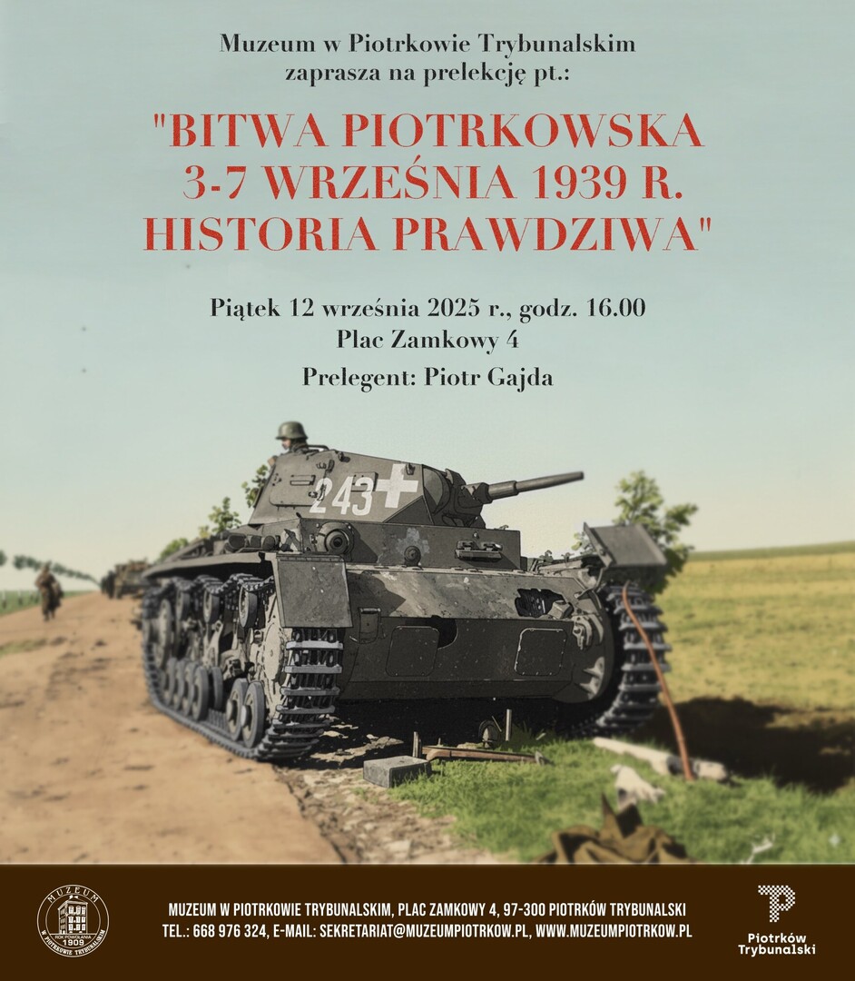 Muzeum w Piotrkowie zaprasza na wyjątkową prelekcję historyczną w Muzeum w Piotrkowie Trybunalskim. Już w piątek, 12 września 2025 r., o godz. 16:00 spotkamy się w naszym muzeum (Plac Zamkowy 4), aby wysłuchać wykładu pt.: „Bitwa Piotrkowska 3–7 września 1939 r. – historia prawdziwa”.