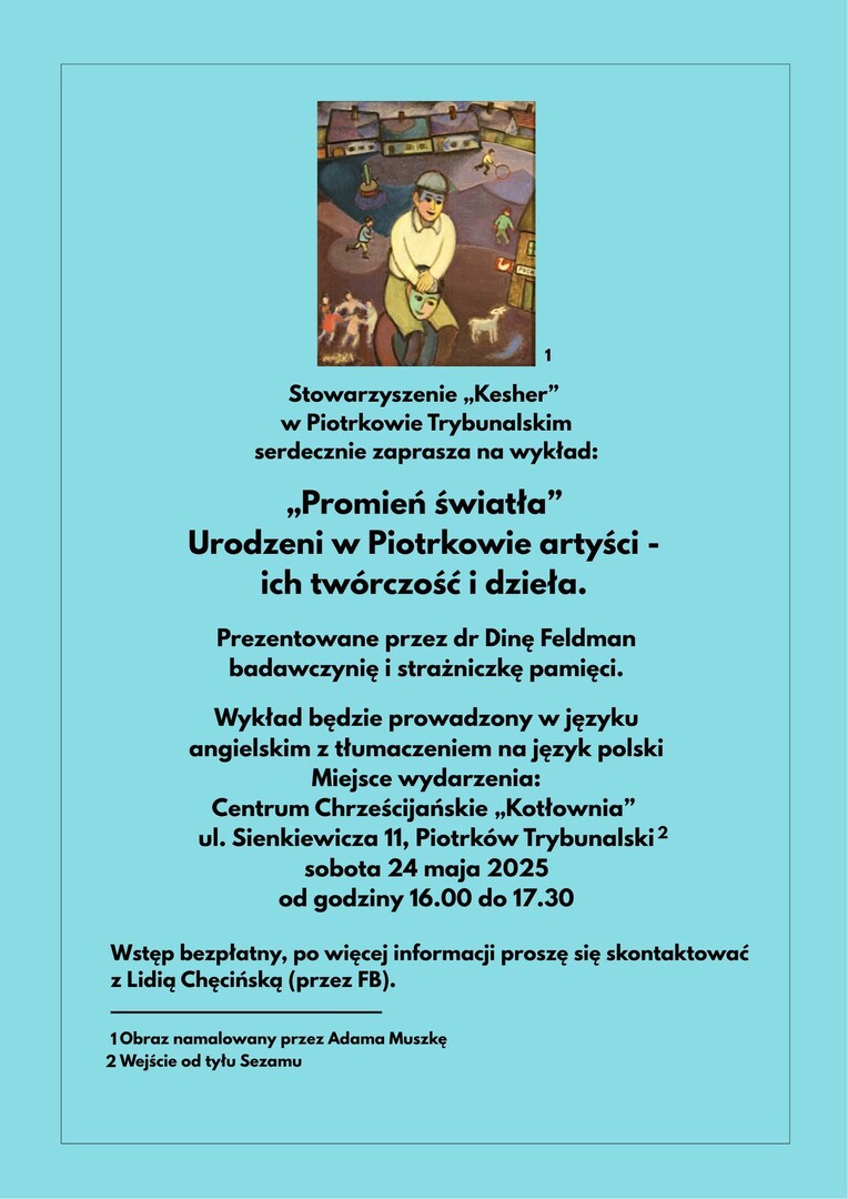 Stowarzyszenie „Kesher” w Piotrkowie Trybunalskim serdecznie zaprasza na wykład: „Promień światła” Urodzeni w Piotrkowie artyści – ich twórczość i dzieła. Prezentowane przez dr Dinę Feldman badaczkę i strażniczkę pamięci.