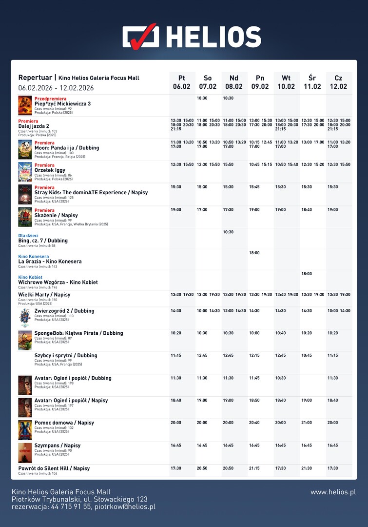 Helios w Piotrkowie Trybunalskim odsłania kolejny repertuar, w którym mocny akcent pada już na przedpremierę. Trzecia odsłona „Piep*zyć Mickiewicza” zapowiada emocjonalny finał licealnej historii o dorastaniu, wyborach i relacjach wystawionych na próbę. Obok niej w kinach pojawią się nowe premiery – od familijnych animacji i kontynuacji popularnych komedii, przez kino grozy, po muzyczne widowisko światowej gwiazdy K-popu. Całość uzupełniają propozycje dla najmłodszych oraz seanse specjalne w ramach Kina Konesera i Kina Kobiet.