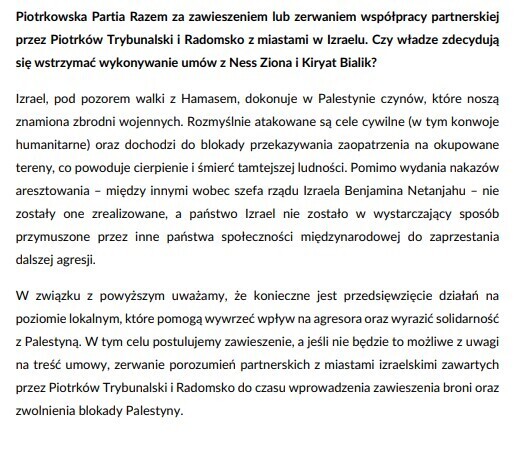 Prezydent Juliusz Wiernicki wypowiedział się w sprawie petycji partii Razem, która wystosowała petycje do rad miejskich Piotrkowa i Radomska, domagając się zawieszenia lub zerwania współpracy partnerskiej z izraelskimi miastami Ness Ziona i Kiryat Bialik. Inicjatywa wywołała kontrowersje, ponieważ dotyczy nie tylko lokalnych umów partnerskich, ale także wrażliwej kwestii polityki międzynarodowej i oskarżeń o zbrodnie wojenne w Strefie Gazy. Razem podkreśla, że celem jest sprzeciw wobec polityki państwa Izrael i wyrażenie solidarności z ludnością Palestyny, a nie atak na ludność żydowską.
