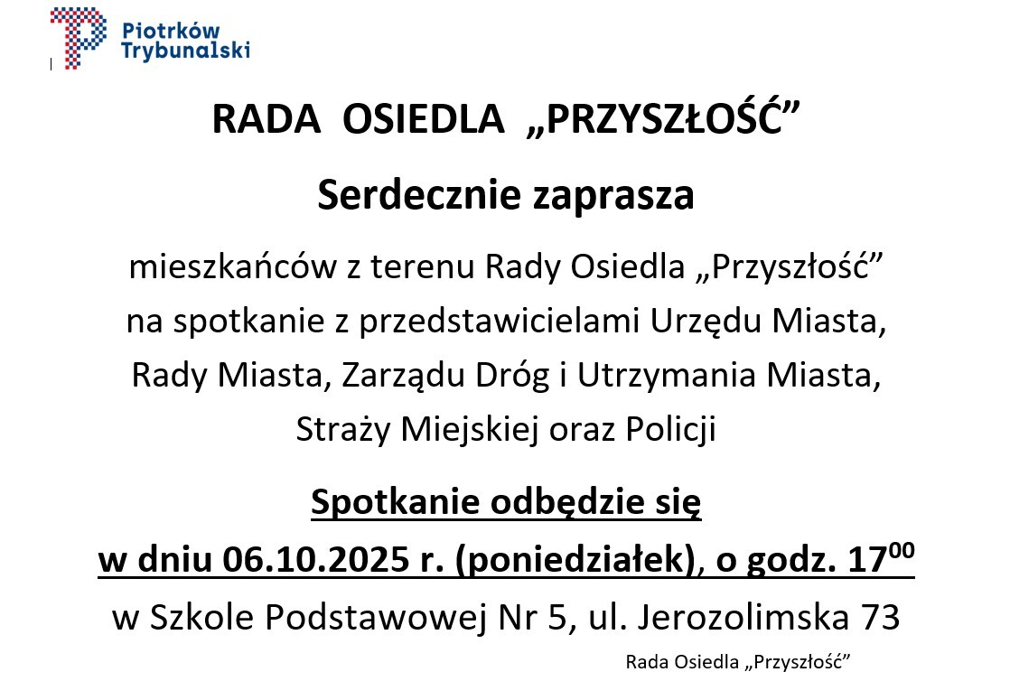 Kolejne spotkanie dla mieszkańców tym razem organizuje Rada Osiedla Przyszłość. To okazja, by spotkać się z przedstawicielami Urzędu Miasta, Rady Miasta, Zarządu Dróg i Utrzymania Miasta oraz pracownikami Straży Miejskiej i piotrkowskiej komendy policji. Spotkanie odbędzie się 6 października (poniedziałek). Początek o godz. 17 w Szkole Podstawowej nr 5 przy ul. Jerozolimska 73.