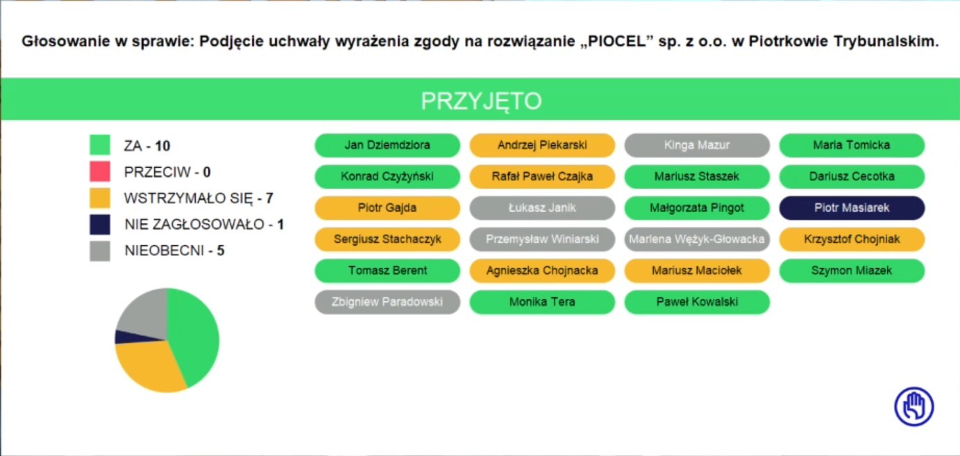 Rada Miasta podjęła decyzję o rozwiązaniu spółki: 10 radnych głosowało "za", 7 wstrzymało się, 1 nie zagłosował.