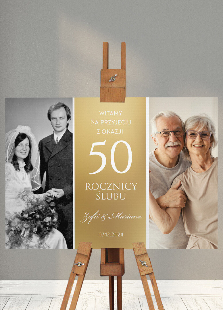 Tablica powitalna ze zdjęciem – dekoracja na 50. rocznicę ślubu To element, który wita gości już od progu i nadaje ton całej uroczystości. Personalizowana tablica z archiwalnym zdjęciem pary to nie tylko ozdoba, ale też piękny symbol wspólnej drogi. Doskonale prezentuje się przy wejściu lub w centralnym punkcie sali.