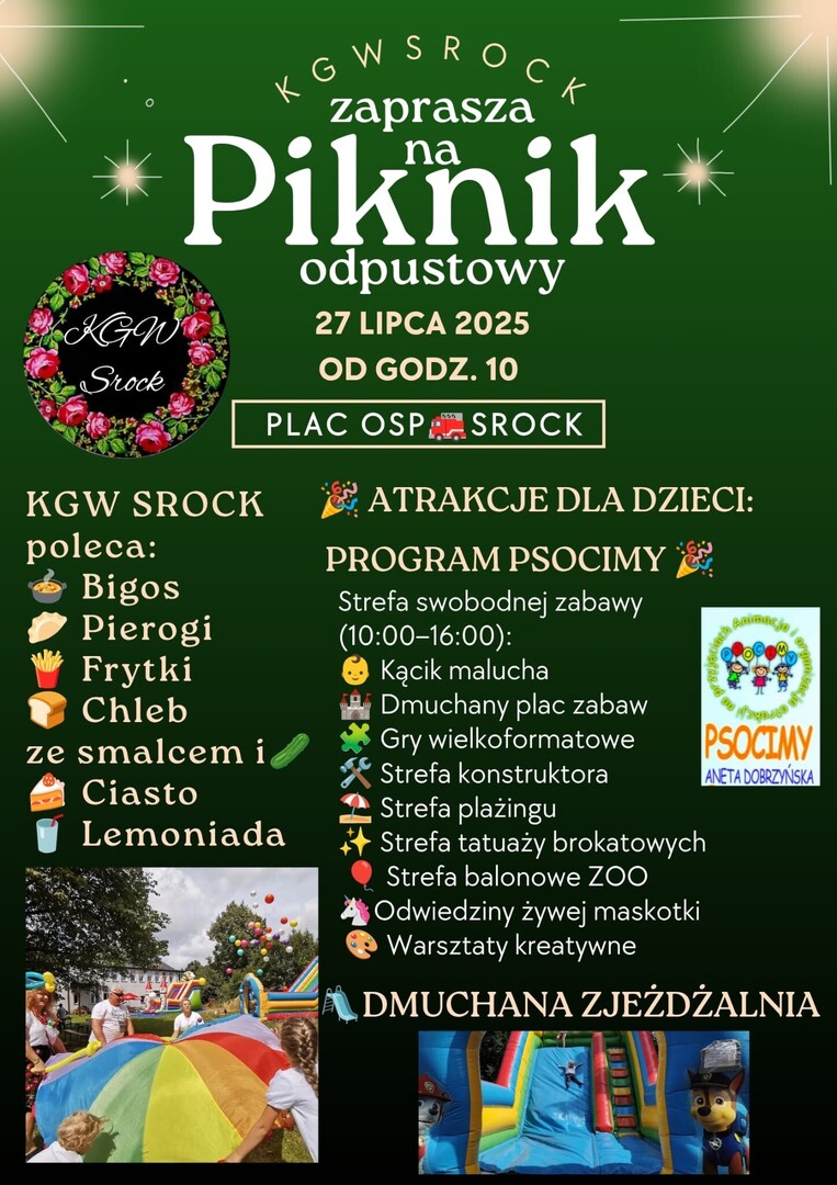 Koło Gospodyń Wiejskich ze Srocka serdecznie zaprasza wszystkich mieszkańców i gości na wyjątkowe wydarzenie – Piknik Odpustowy, który odbędzie się 27 lipca na placu OSP w Srocku. Start imprezy o godzinie 10:00.