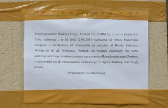 Od poniedziałku (12.08.2024), rozpocznie się modernizacja odcinka ulicy Roosevelta w Piotrkowie Trybunalskim, obejmująca fragment od ronda Żołnierzy Wyklętych do ulicy Próchnika. Prace będą wiązały się z całkowitym zamknięciem tego odcinka dla ruchu, co może powodować utrudnienia w poruszaniu się po okolicy.