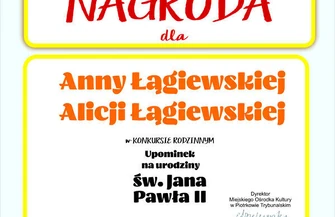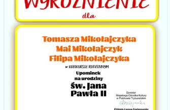„Upominek na urodziny św. Jana Pawła II” to konkurs, który został ogłoszony przez piotrkowski MOK kilka tygodni temu. Polegał na nagraniu krótkiego wiersza ks. Jana Twardowskiego przez dzieci i ich rodziców, dziadków czy też rodzeństwo. Łącznie napłynęło kilkanaście zgłoszeń. Jury, które obradowało 18 maja, tj. w dzień na który przypadała setna rocznica urodzin Karola Wojtyły, obok ww. laureatów postanowiło także przyznać kilka wyróżnień. Otrzymali je: Tomasz Mikołajczyk, Maja Mikołajczyk i Filip Mikołajczyk (za interpretację wiersza „Obiecanki cacanki”), Małgorzata Dziemdziora i Iga Wnuk (za interpretację wiersza „Sprawiedliwość”), Iwona Jędrzejczyk i Kalina Jędrzejczyk (za interpretację wiersza „W kropki zielone”), Iwona Czarnecka z córką i babcią (za interpretację wiersza „W niebie czy na ziemi”), Marta Jaworska, Jarosław Jaworski, Kornelia Jaworska i Kacper Jaworski (za interpretację wiersza „Obiecanki cacanki”), Anna Kowalska, Piotr Kowalski oraz Bartosz Kowalski (za interpretację wiersza „Nie krzycz”).