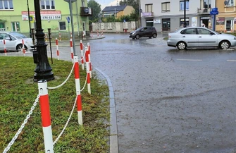 Tworzyły się dość duże i głębokie kałuże. Kierowcy jechali ostrożnie i powoli, bo wody ciągle przybywało. Znajdujące się przy krawężnikach studzienki nie nadążały odprowadzać takich opadów na bieżąco.