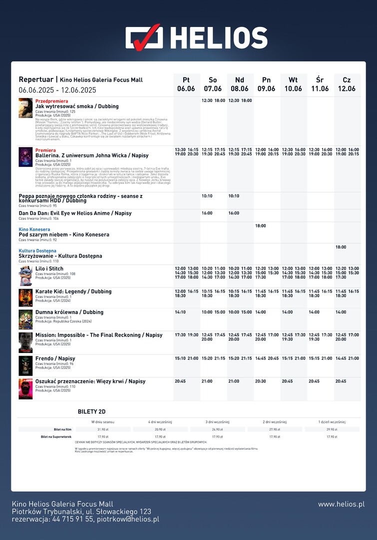 Gorące nowości filmowe w kinie Helios - Piotrków Trybunalski. Przedpremierowo "Jak wytresować smoka". Na wyspie Berk, gdzie wikingowie i smoki są zaciekłymi wrogami od pokoleń mieszka Czkawka (Mason Thames; „Czarny telefon”). Pomysłowy, ale niedoceniony syn wodza (Gerard Butler, powtarzający swoją rolę z animowanej serii), Czkawka przeciwstawia się wielowiekowej tradycji, kiedy zaprzyjaźnia się ze Szczerbatkiem. Premierowo "Ballerina. Z uniwersum Johna Wicka". Siedmioletnia Eve trafia do rodziny zastępczej, po tym, gdy jej ojciec zostaje zamordowany, a młodsza siostra uprowadzona. Przepełniona gniewem i żądzą zemsty zwraca na siebie uwagę tajemniczej organizacji Ruska Roma, która przygarnia ją i doskonali w sztuce tańca i zabijania. I to nie wszystkie nowości w kinie Helios w Piotrkowie.