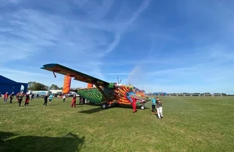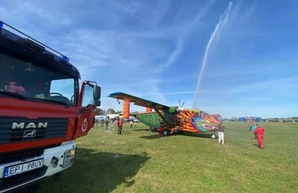 Na płycie lotniska zebrali się piloci i skoczkowie spadochronowi, aby zobaczyć nowy samolot. Byli tam także strażacy z OSP Przygłów, którzy powitali "smoka" specjalną salwą wodną.