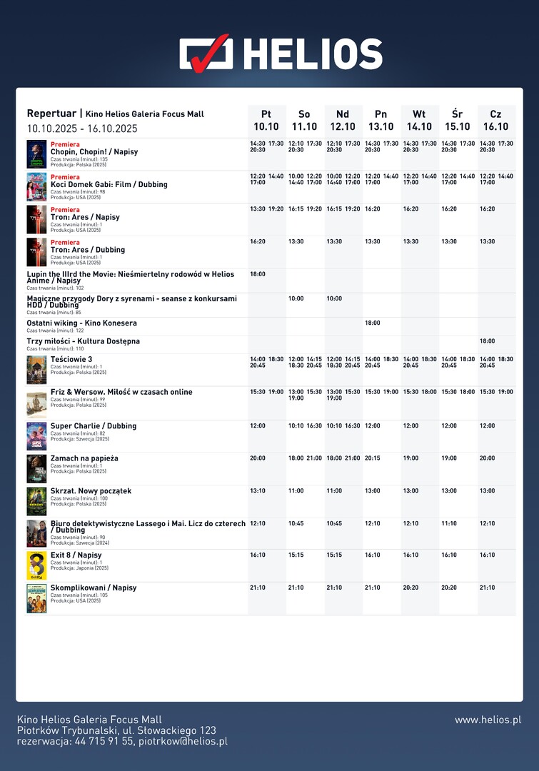 W kinie Helios w Piotrkowie Trybunalskim czeka prawdziwa filmowa uczta – od wielkich emocji, przez przygody, aż po klasykę w nowym wydaniu. Wśród premier zobaczymy „Chopin, Chopin!” – pełną pasji opowieść o genialnym kompozytorze w paryskim świecie artystów, widowiskowy „Tron: Ares” o starciu człowieka ze sztuczną inteligencją oraz familijny hit „Koci Domek Gabi: Film”, który zabierze najmłodszych do magicznej krainy Mrau Francisco. W repertuarze znalazły się także anime „Lupin the IIIrd: Nieśmiertelny rodowód”, bajkowe „Magiczne przygody Dory z syrenami”, dramat „Ostatni wiking” w ramach Kina Konesera oraz polskie „Trzy miłości” w cyklu Kultura Dostępna. Na ekranach wciąż goszczą też hity, takie jak „Teściowe 3”, „Exit 8” czy „Skomplikowani” – idealne propozycje na jesienny seans.
