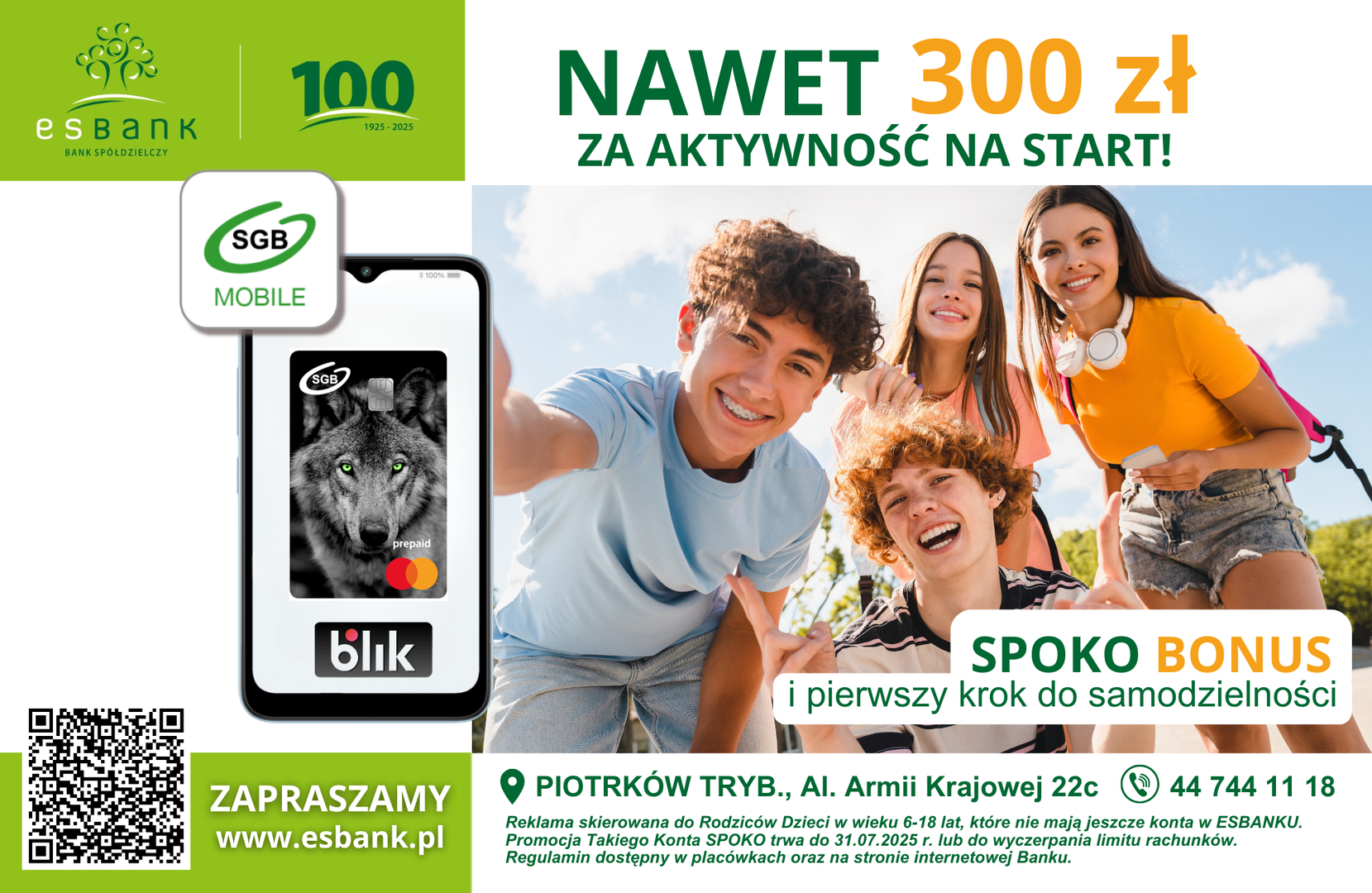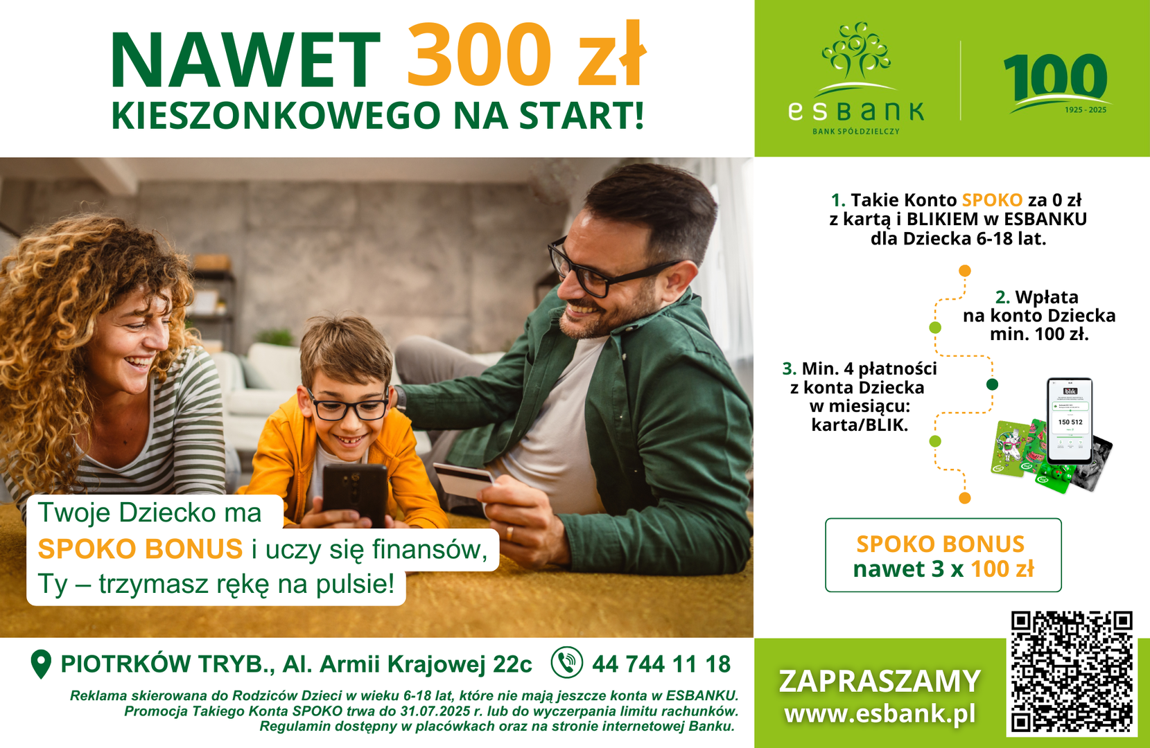 To nie wszystko. Jeśli masz już konto w ESBANKU lub jej założysz, następnie przed 31 lipca 2025 r. otworzysz dziecku Takie konto SPOKO, a Twój Junior będzie z niego aktywnie korzystać, możecie zgarnąć nawet 300 zł kieszonkowego od Banku – po 100 zł przez 3 miesiące. Warunkiem jest 1-razowy wpływ min. 100 zł miesięcznie i 4 płatności w sklepie stacjonarnym lub online kartą/BLIKIEM w miesiącu kalendarzowym. To realna korzyść i doskonała motywacja dla dziecka do nauki systematyczności.