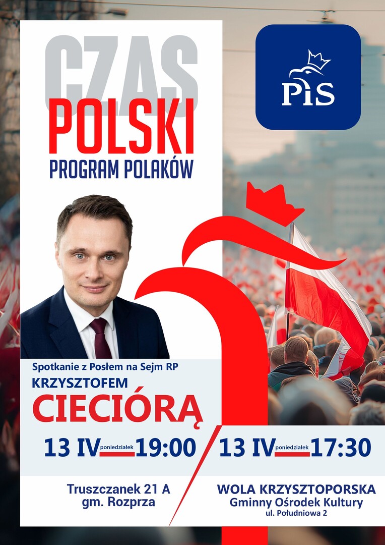 W najbliższy poniedziałek, 13 kwietnia, mieszkańcy regionu będą mieli okazję spotkać się z posłem na Sejm RP, Krzysztofem Cieciórą, reprezentującym Prawo i Sprawiedliwość. Wydarzenia odbędą się w dwóch miejscowościach: Truszczanku oraz Woli Krzysztoporskiej.