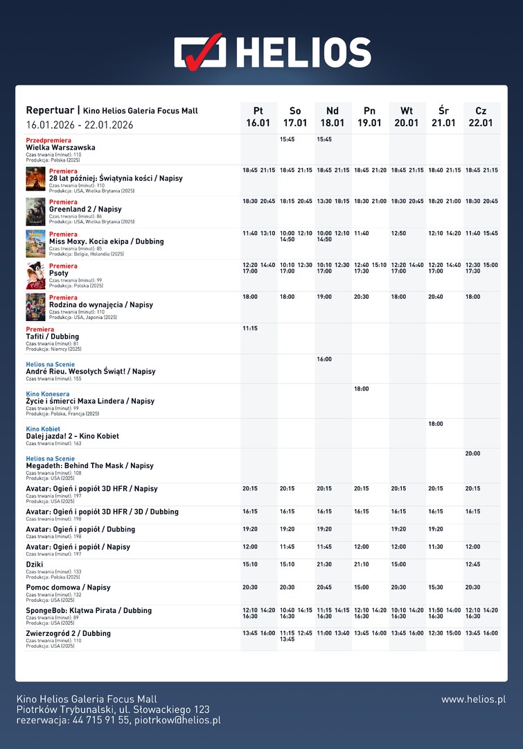 Kino Helios w Piotrkowie Trybunalskim przygotowało na najbliższe dni repertuar, który łączy przedpremierowe emocje z głośnymi premierami i sprawdzonymi hitami. Na ekranach pojawi się m.in. „Wielka Warszawska” – opowieść o kulisach wyścigów konnych i moralnych wyborach w czasach przełomu, ale także widowiskowe kino postapokaliptyczne, familijne animacje, poruszające historie o relacjach międzyludzkich oraz wyjątkowe seanse specjalne. To propozycja zarówno dla miłośników ambitnych historii, jak i widzów szukających rozrywki dla całej rodziny.