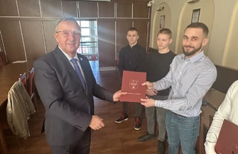 Burmistrz Andrzej Jaros w towarzystwie Elżbiety Bijoch, Sekretarza Gminy wręczył przyznane stypendia następującym sportowcom: