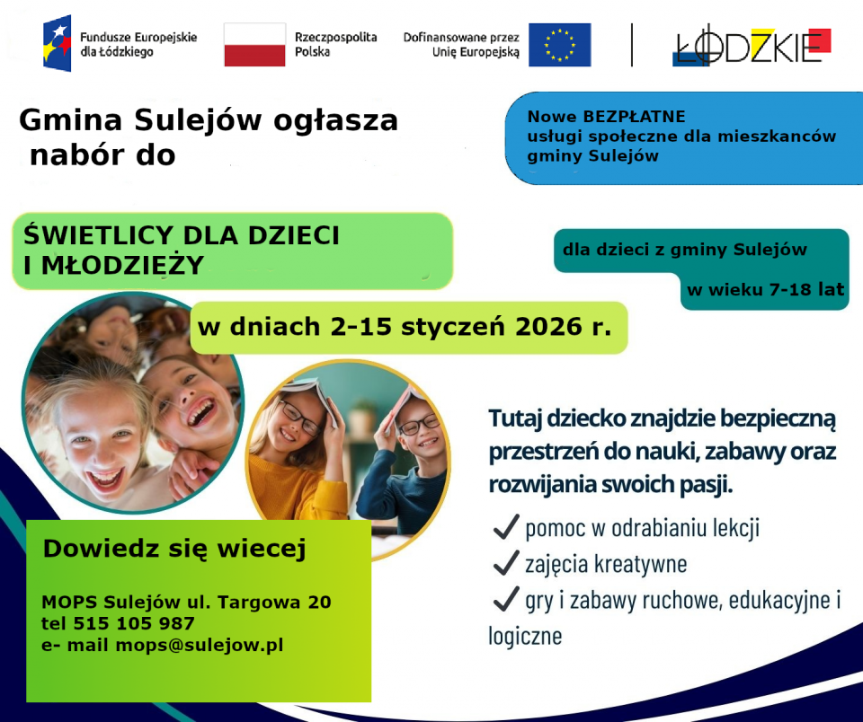 Już w lutym 2026 roku w Sulejowie rozpocznie działalność bezpłatna świetlica dla dzieci i młodzieży oraz punkt wsparcia rodziny. To efekt realizacji projektu „Rodzinny Sulejów”, na który gmina pozyskała dokładnie 1 883 289,20 zł dofinansowania. Nabór trwa do 15 stycznia.
