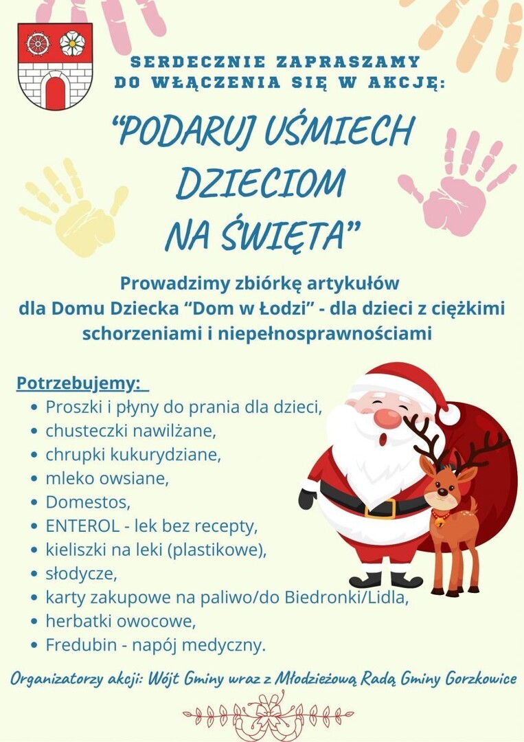 W Gminie Gorzkowice ruszyła wyjątkowa świąteczna akcja „Podaruj uśmiech dzieciom na Święta”. Tegoroczna zbiórka dedykowana jest podopiecznym Domu Dziecka „Dom w Łodzi” – dzieciom z ciężkimi schorzeniami i niepełnosprawnościami, które każdego dnia potrzebują nie tylko naszej troski, ale także specjalistycznych produktów pierwszej potrzeby.