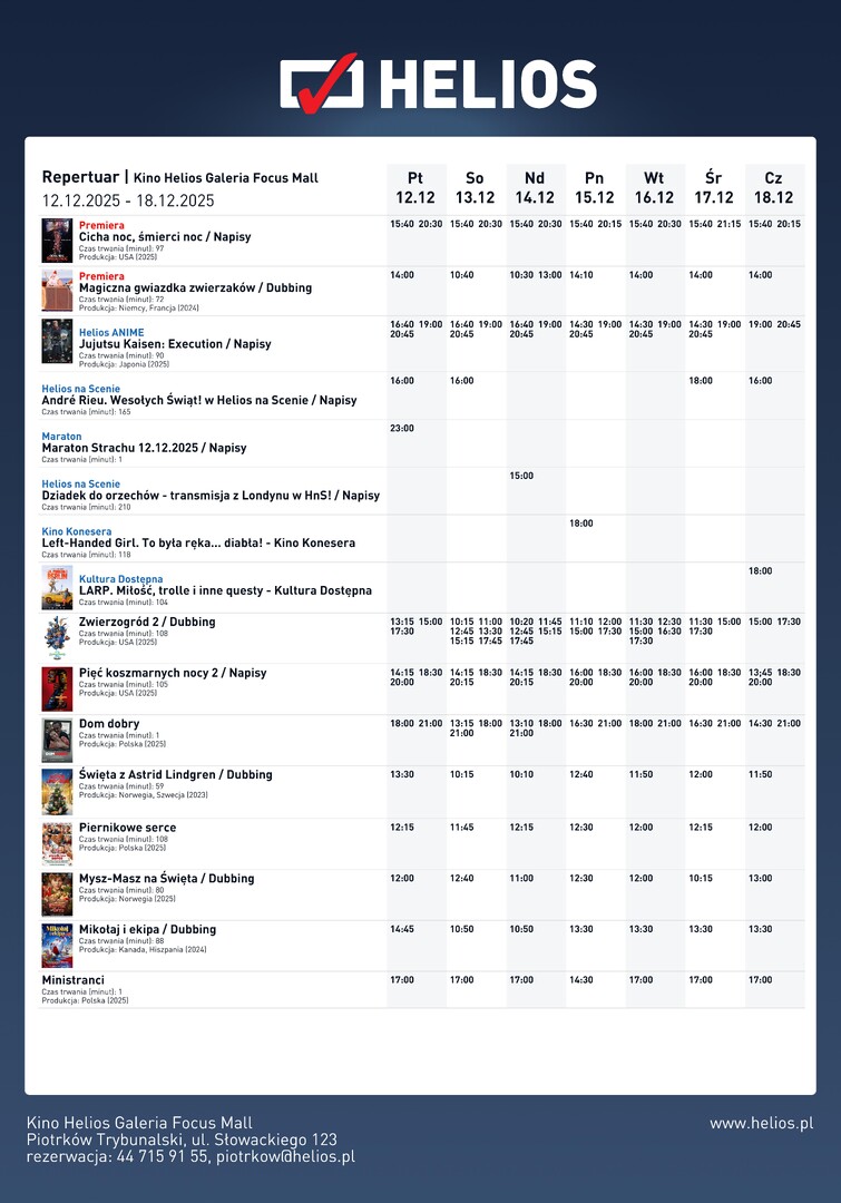 W kinie Helios w Piotrkowie Trybunalskim świąteczny klimat spotyka grozę, magię i wielkie emocje. Na widzów czekają gorące premiery – od mrożącego krew w żyłach horroru „Cicha noc, śmierci noc”, po pełną uroku animację „Magiczna gwiazdka zwierzaków”. W repertuarze nie brakuje także mocnych anime, koncertowych widowisk, klasycznych transmisji baletowych oraz maratonu dla fanów solidnych dreszczy. A do tego – filmowe perełki w cyklach Konesera i Kultury Dostępnej oraz familijne hity, które wciąż przyciągają do kin.