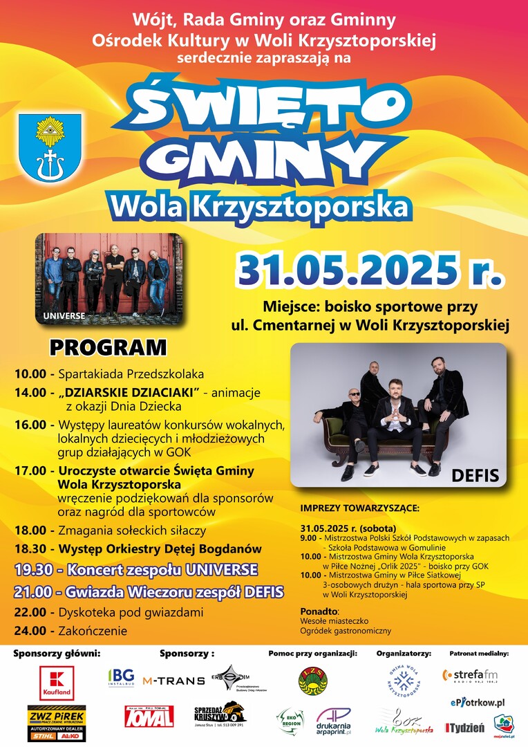 Wójt, Rada Gminy oraz Gminny Ośrodek Kultury w Woli Krzysztoporskiej serdecznie zapraszają na Święto Gminy, które odbędzie się 31 maja 2025 roku na boisku sportowym przy ul. Cmentarnej w Woli Krzysztoporskiej. Wystąpią zespoły UNIVERSE i DEFIS.