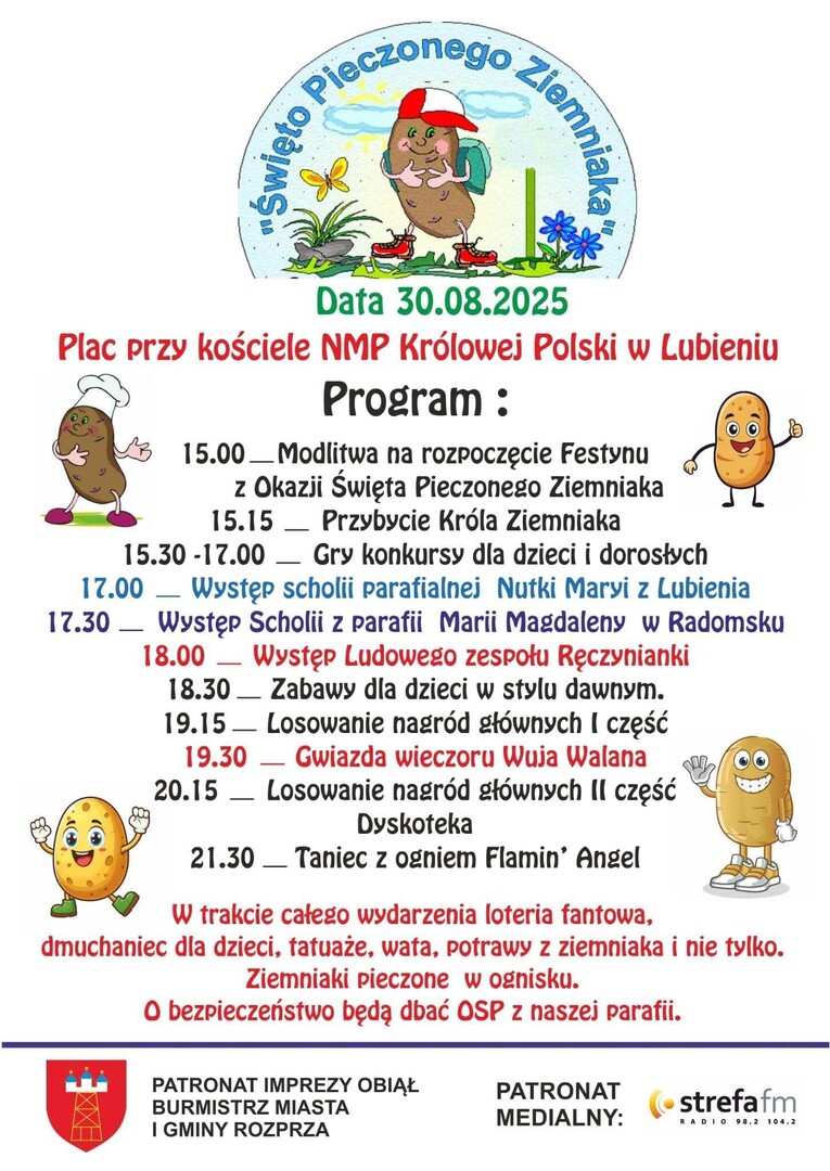 Impreza rozpocznie się o godzinie 15:00 modlitwą i symbolicznym przybyciem Króla Ziemniaka. Dla najmłodszych i dorosłych przygotowano konkursy, zabawy w dawnym stylu oraz występy artystyczne, w tym scholii parafialnych z Lubienia i Radomska. Na scenie pojawi się również zespół ludowy Ręczynianki, a gwiazdą wieczoru będzie Wuj Walan.