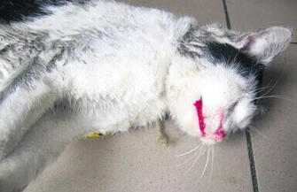 *Sześciomiesięczny kotek został żywcem wrzucony do gorącego pieca. Próbował uciekać i zaklinował się w rurze odprowadzającej dym. Zwłoki zwierzęcia zostały wyciągnięte przez policjantów. Martwy kot zginął w pozycji zasłaniającej łapkami oczy.