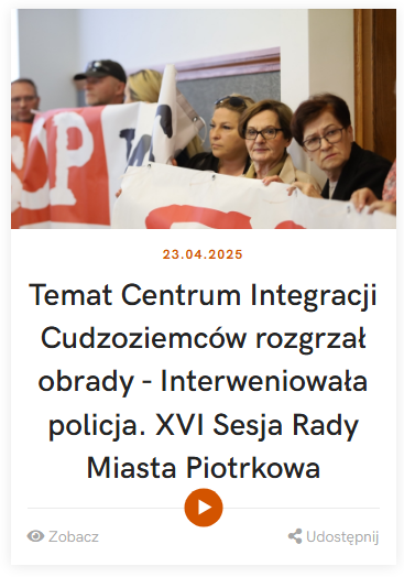Burzliwa sesja Rady Miasta Piotrkowa Trybunalskiego. Jednym z punktów, nad którymi debatowali rajcy była dyskusja na temat Centrum Integracji Cudzoziemców. Na zaproszenie m.in. radnego Łukasza Janika na sesję przyszli mieszkańcy, którzy są przeciwni powstaniu takiego centrum. Do budynku UM została wezwana policja. Radiowozy stały też przed magistratem. Emocje były ogromne z udziałem radnych, przewodniczącego, prezydenta, wiceprezydenta i mieszkańców. Prezydent Piotrkowa podkreślił, że przyjęcie stanowiska będzie strata unijnych pieniędzy, aż 148 mln złotych. Sesja ze względu na brak możliwości dokończenia wypowiedzi Juliusza Wiernickiego, została przełożona na piątek (25.04.2025).