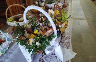 Koszyk, najczęściej z wikliny, przystraja się listkami bukszpanu lub borowiny.