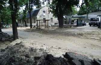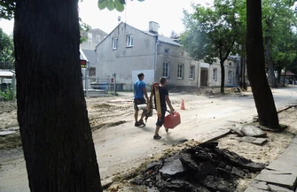 W związku z robotami ulica jest całkowicie zamknięta dla ruchu kołowego, piesi mogą poruszać się jedną stroną chodnika.