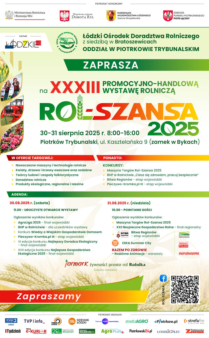XXXIII Promocyjno-Handlową Wystawę Rolniczą ROL-SZANSA 2025 już 30 i 31 sierpnia 2025 r. w godz. 8.00–16.00, przy ul. Kasztelańskiej 9, w Piotrkowie Trybunalskim (tereny wystawowe wokół zamku w Bykach)