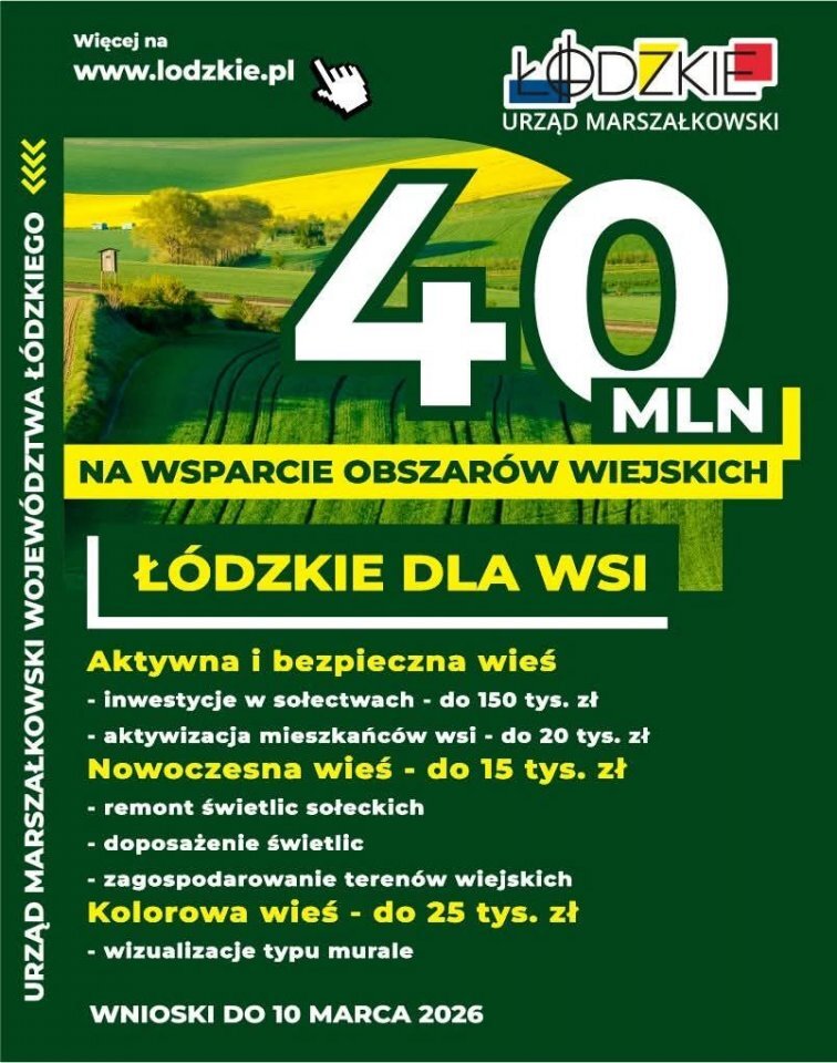 Drodzy Mieszkańcy, Sołtysi i Samorządowcy. Wspólnie z Zarządem Województwa Łódzkiego ogłaszamy nowy nabór wniosków w ramach naszego flagowego programu „Łódzkie dla wsi”. To aż 40 000 000 zł, które trafią bezpośrednio do Waszych sołectw, aby zmieniać naszą lokalną rzeczywistość na lepsze.