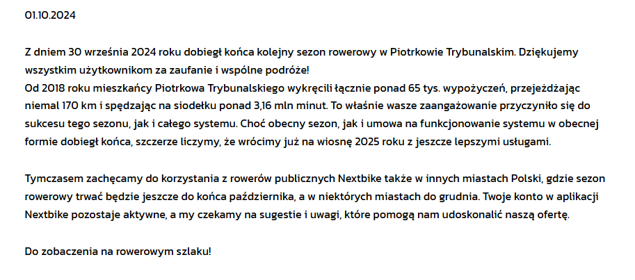 Wyszukując informacje o rowerze miejskim, możemy trafić na aktywną stronę piotrkowskirower.pl - operatora firmy Nextbike. Strona nie została zaktualizowana od 2024 roku i możemy na niej przeczytać, iż operator szczerze wierzy, że wróci na piotrkowski rynek od wiosny 2025 roku.