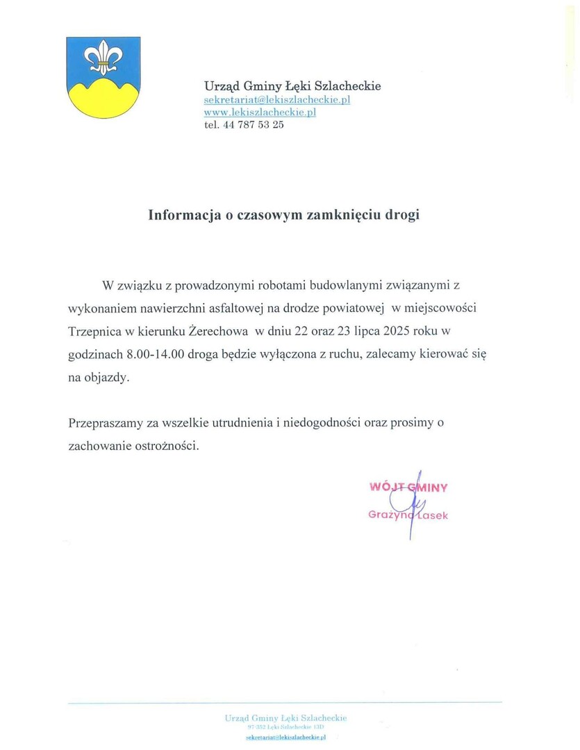 Jak informuje urząd gminy Łęki Szlacheckie, w dniach 22 oraz 23 lipca w związku z robotami budowlanymi - wykonaniem nawierzchni asfaltowej na drodze powiatowej w miejscowości Trzepnica w kierunku Żerechowa, droga będzie wyłączona z ruchu. Urząd wyznaczył objazdy.