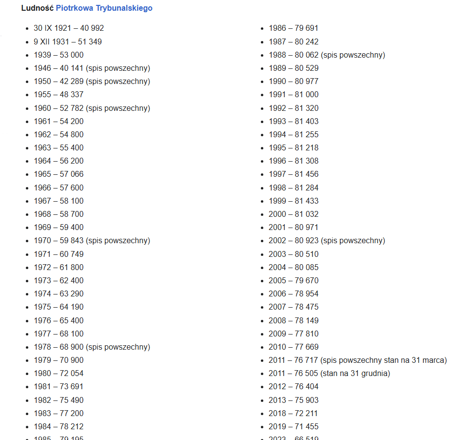 Według danych GUS z 31 grudnia 2023 r., Piotrków Trybunalski liczył 66 519 mieszkańców i był pod względem liczby ludności drugim (po Łodzi) miastem w województwie łódzkim, a także 50. spośród najludniejszych miast w Polsce.