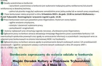 W tym roku oprócz konkursu na najpiękniejsza palmę odbędzie się także konkurs na najładniejszą pisankę wielkanocną. Udział w konkursie może wziąć każdy. Prace konkursowe będą przyjmowane w dniu Jarmarku od godziny 10.00 do 13.00. Około godz. 14.30 zaplanowano wręczenie nagród dla twórców.