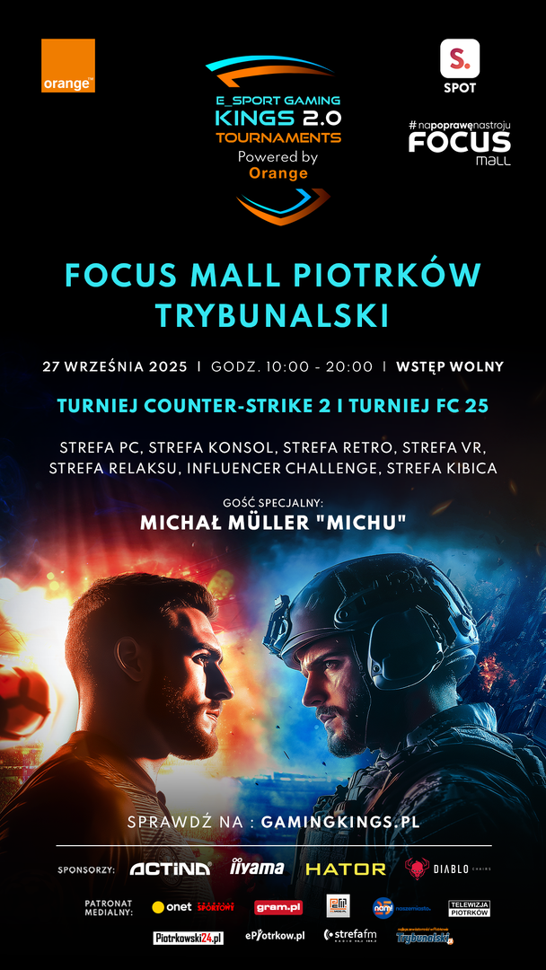 Druga edycja E-Sport Gaming Kings Tournaments 2.0 Powered by Orange to jedno z największych wydarzeń e-sportowych w Polsce. W sobotę 27 września w Focus Mall w Piotrkowie Trybunalskim gracze Counter-Strike 2 i EA Sports FC 25 zmierzą się w bezpośrednich starciach o nagrody, uznanie i bilety do ogólnopolskiego finału. Nie zabraknie ciekawych gości, m.in. zawodowych graczy e-sportu, takich jak Michał Müller (Michu). Wydarzeniu towarzyszą panele eksperckie dotyczące e-sportu.