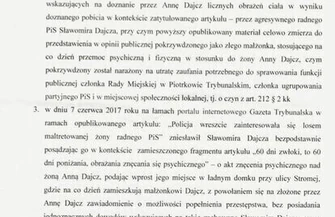 Materiałów o radnym i jego rodzinie opublikowanych na gazetatrybunalska.pl było więcej. Wg sądu Baryła zniesławił radnego Piotrkowa również w tekście z 25 maja 2017 r. („Rozmowa z Anną Dajcz ofiarą agresji swojego męża radnego PiS Sławomira Dajcza”) oraz z 7 czerwca 2017 r. („Policja wreszcie zainteresowała się losem maltretowanej żony radnego PiS”). W tym ostatnim Baryła bezpodstawnie posądził S. Dajcza o psychiczne i fizyczne znęcanie się nad żoną, bez podania jednoznacznych dowodów.