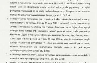 W materiale, który ukazał się w 2017 r. na portalu Baryła zamieścił fragment nagrania, który celowo przedstawia S. Dajcza w oczach opinii publicznej jako złego małżonka. Wg sądu nagranie prezentujące zachowanie żony radnego celowo nie zostało opublikowane. Przez takie działanie autora materiału radny Piotrkowa został narażony na utratę zaufania potrzebnego do sprawowania funkcji publicznej.