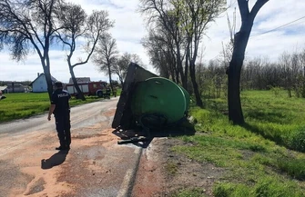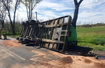 Od ciężarówki przewożącej zbiornik z nieczystościami asenizacyjnymi odpięła się naczepa, co doprowadziło do jej wywrócenia i wylania zawartości. Na drodze krajowej 91 są utrudnienia.