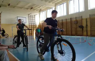 b) jazdę rowerem w miasteczku ruchu drogowego,