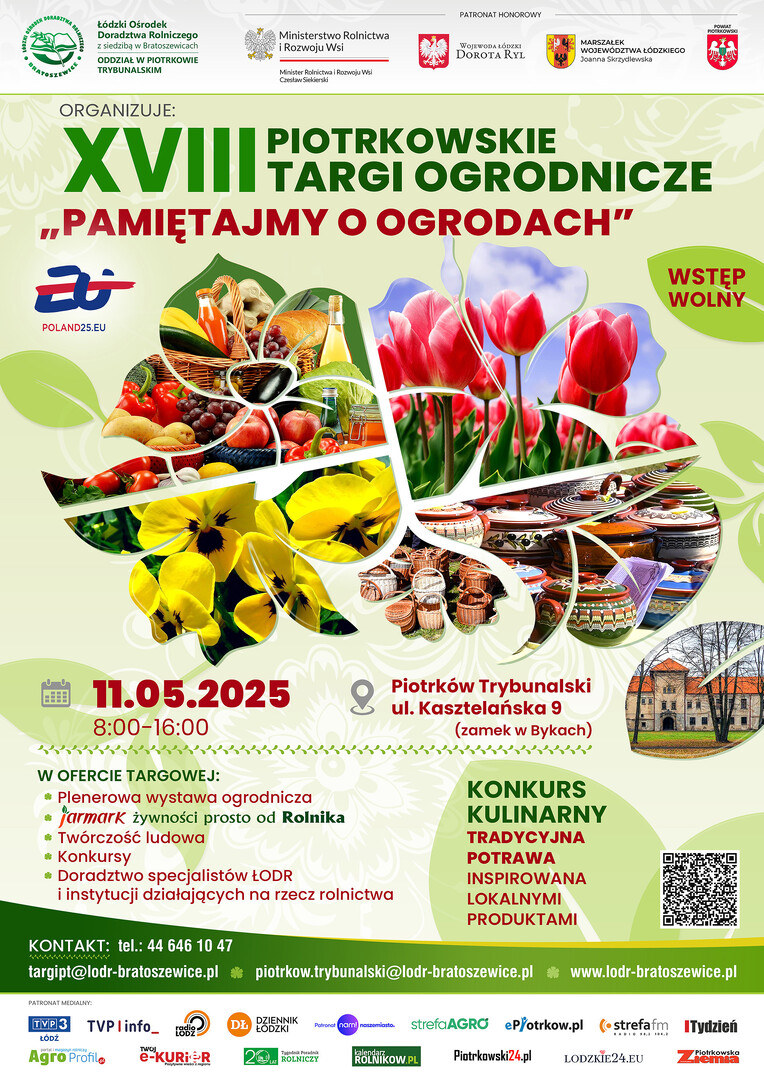 Łódzki Ośrodek Doradztwa rolniczego zaprasza 11 maja na XVIII Piotrkowskie Targi Ogrodnicze "Pamiętajmy o Ogrodach", które odbędą się tradycyjnie na terenach wokół zamku w Bykach przy ul. Kasztelańskiej 9 w Piotrkowie Trybunalskim. Targi potrwają od godziny 8:00 do 16:00, a ich uroczyste otwarcie zaplanowano na godzinę 11:00.