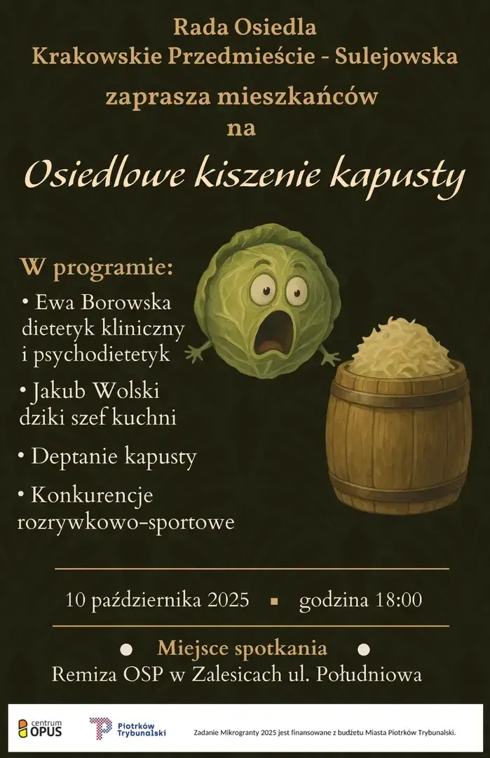 Rada Osiedla Krakowskie Przedmieście-Sulejowska zaprasza na sąsiedzkie kiszenie kapusty. W programie także spotkanie z dietetykiem Ewą Borowską i dzikim szefem kuchni Kubą Wolskim.