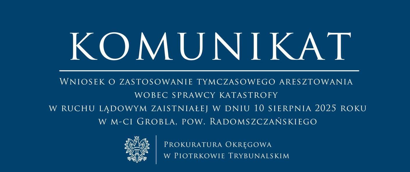 Prokuratura Rejonowa w Radomsku prowadzi śledztwo dotyczące 54 letniego mężczyzny, który w dniu 10 sierpnia 2025 roku ok. godz. 18.00, w m-ci Grobla pow. radomszczańskiego, na drodze nr 3921E, umyślnie naruszył zasady bezpieczeństwa w ruchu drogowym oraz popełnił błędy w technice i taktyce jazdy w ten sposób, że będąc w stanie nietrzeźwości 0,65 mg/l alkoholu w wydychanym powietrzu nienależycie obserwował przedpole jazdy oraz nie dostosował prędkości do istniejących warunków drogowych i najechał na poruszającą się w tym samym kierunku kolumnę pieszych -Pieszej Pielgrzymki Diecezji Radomskiej, w ilości 156 osób doprowadzając do potrącenia 11 (jedenastu) osób i powodując obrażenia ich ciała między innymi w postaci: złamań kończyn dolnych, złamania kostki bocznej prawej, podbiegnięć krwawych i stłuczeń kończyn dolnych oraz bioder, urazów głowy, kręgosłupa, licznych otarć naskórka, a nadto sprowadził bezpośrednie niebezpieczeństwo dla życia i zdrowia wielu uczestniczących w pielgrzymce osób.Z ustaleń śledztwa wynika również, że podejrzany prowadząc pojazd mechaniczny marki Opel Vectra jednocześnie naruszył, orzeczony wobec niego prawomocnym wyrokiem Sądu Rejonowego w Zawierciu, zakaz prowadzenia wszelkich pojazdów mechanicznych obowiązujący od 5 czerwca 2025 roku do 5 grudnia 2025 roku.W dniu 12 sierpnia 2025 roku w Prokuraturze Rejonowej w Radomsku wykonano czynności procesowe z udziałem podejrzanego Jarosława R., któremu ogłoszono zarzuty:I. spowodowania katastrofy w ruchu lądowym zagrażającej zdrowiu i życiu zdrowiu wielu osób, tj., o czyn 173§1 k.k. w zb. z art 178§1 k.k. w zw. z art.11§2 k.k.;II. kierowania pojazdem mechanicznym w stanie nietrzeźwości, pomimo orzeczonego zakazu prowadzenia pojazdów mechanicznych, tj., o czyn z art. 244 k.k. w zb. z art. 178a § 1 kk w zw. z art. 11 § 2 k.k.W dniu dzisiejszym Prokurator Rejonowy w Radomsku skierował do Sądu Rejonowego w Radomsku wniosek o zastosowanie wobec podejrzanego środka zapobiegawczego w postaci tymczasowego aresztowania na okres 3 miesięcy.Czyn zarzucony podejrzanemu zagrożony jest karą do 15 lat pozbawienia wolności.