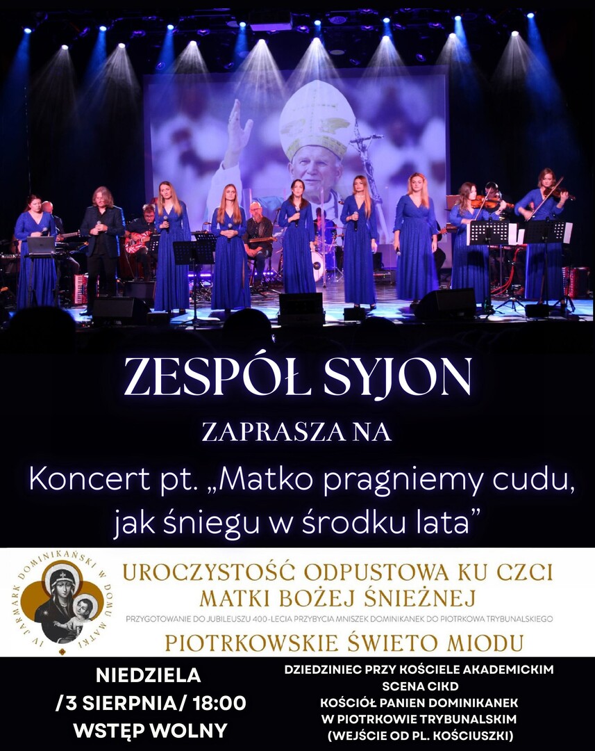 "Matko pragniemy cudu jak śniegu w środku lata" to nazwa koncertu jaki odbędzie się 3 sierpnia o godzinie 18 na scenie Centrum Idei ku Demokracji w Piotrkowie Trybunalskim. Wystąpi znany zespół SYJON. Wydarzenie to jest organizowane w ramach IV Jarmarku Dominikańskiego w Domu Matki w dniach 2-3 sierpnia.
