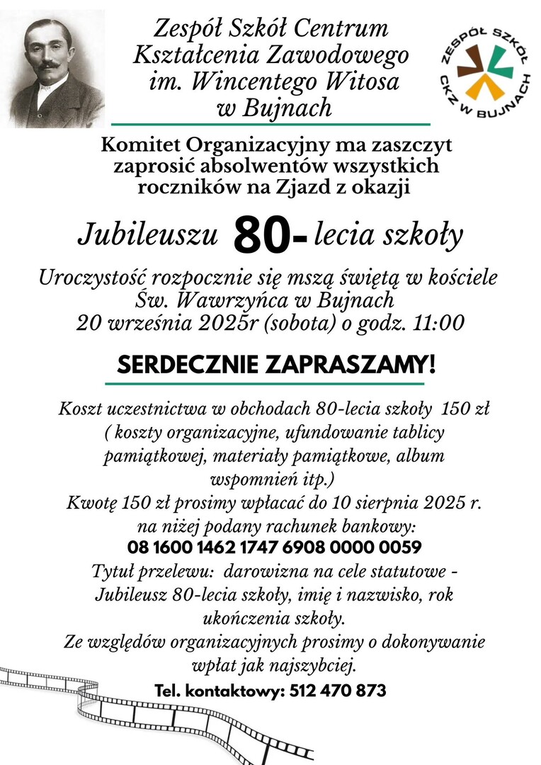 Zespół Szkół CKZ im. Wincentego Witosa w Bujnach przygotowuje się do Jubileuszu 80-lecia szkoły i zjazdu absolwentów. Komitet Organizacyjny zaprasza na uroczystości, które odbędą się 20 września 2025 roku.