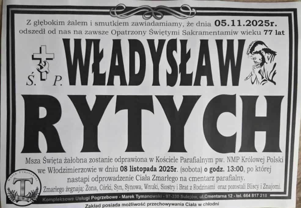 Uroczystości pogrzebowe druha Władysława Rytycha odbędą się w sobotę, 8 listopada 2025 roku, o godz. 13:00 w kościele pw. Najświętszej Maryi Panny Królowej Polski we Włodzimierzowie.
