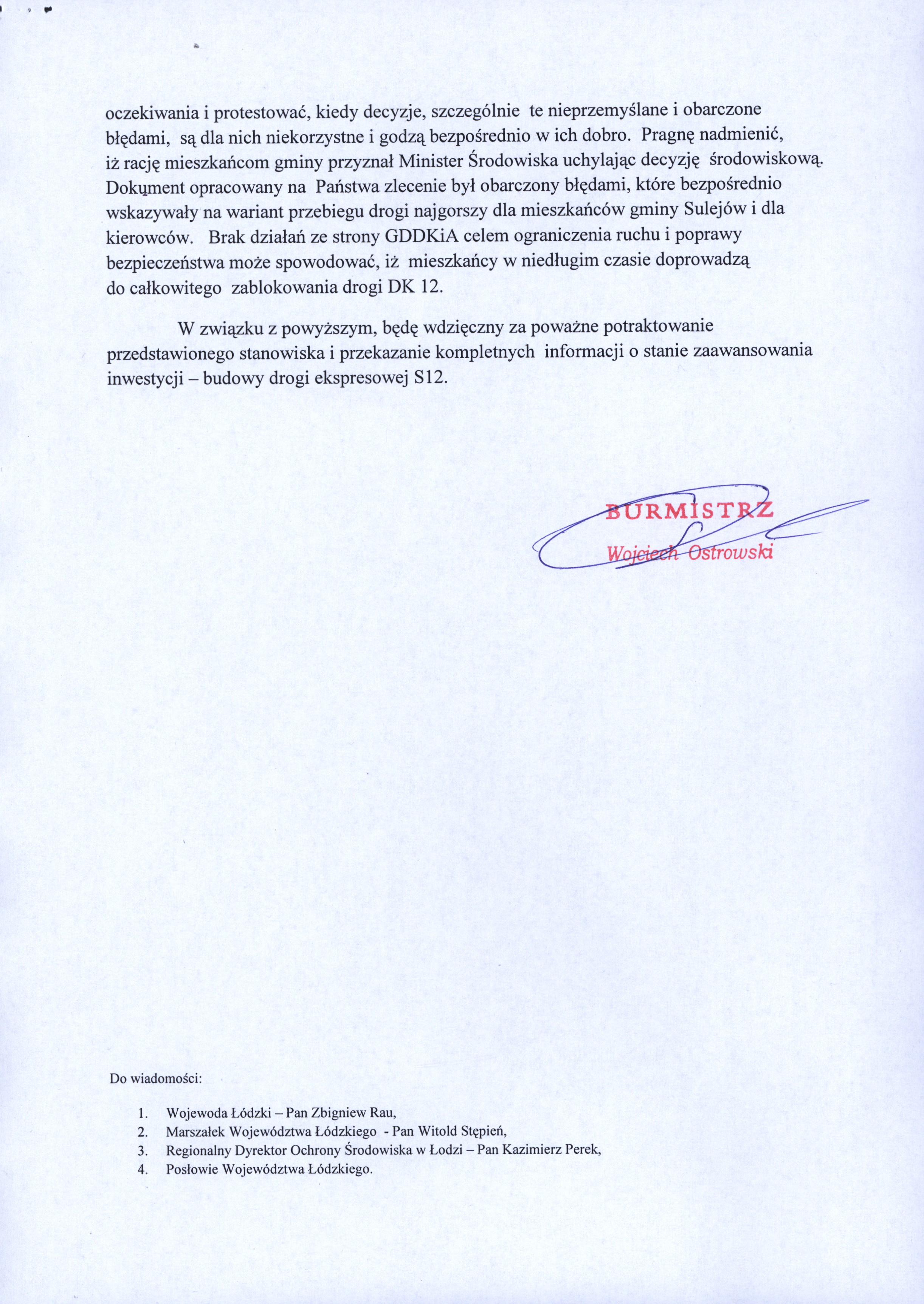 Budowa drogi S12 od dawna wzbudza kontrowersje i emocje. Mieszkańcy Sulejowa i Włodzimierzowa protestowali w ubiegłym roku przeciwko wariantowi trasy, zakładającemu wyburzenie kilkunastu domów. Z kolei wybór drugiej opcji wiązałby się z naruszeniem chronionych stanowisk roślin i zwierząt w obszarze Natura 2000. Co ciekawe, na portalu gminy sulejow.pl opublikowany został list burmistrza Wojciecha Ostrowskiego do dyrektora łódzkiego oddziału Generalnej Dyrekcji Dróg Krajowych i Autostrad, Macieja Tomaszewskiego. Burmistrz odnosi się m.in. do zarzutów, jakoby stanowisko mieszkańców gminy Sulejów, reprezentowanych przez burmistrza, spowodowało brak realizacji inwestycji. - Żądam kategorycznie zaprzestania prezentowania takiej informacji - napisał Ostrowski.