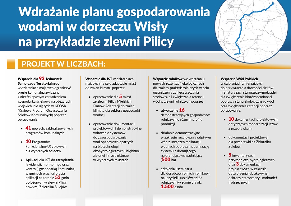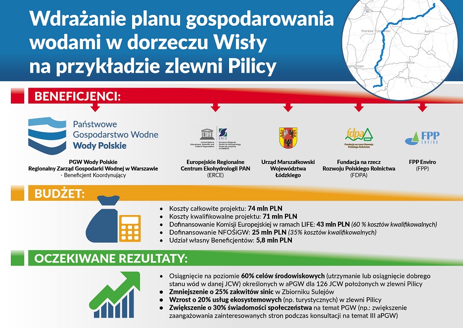 Celem projektu jest poprawa jakości i różnorodności biologicznej wód zlewni Pilicy ze szczególnym uwzględnieniem Zalewu Sulejowskiego. Oczekiwane rezultaty zaplanowanego na 10 lat projektu to m.in. zmniejszenie o 25% zakwitów sinic w Zbiorniku Sulejów oraz wzrost o 20% usług ekosystemowych (np. turystycznych) w zlewni Pilicy. W ramach projektu powstanie System Wspierania Decyzji (SWD), czyli efektywne narzędzie do zarządzania jakością wody w Zalewie Sulejowskim. System przyczyni się do zmniejszania intensywności zakwitów sinic i zapewni trwałe bezpieczeństwo powodziowe miastu Sulejów. Projekt pozwoli też podjąć walkę z nieefektywnym zarzadzaniem gospodarką ściekową na obszarach wiejskich. Rolnicy otrzymają wsparcie we wdrażaniu nowych rozwiązań ekologicznych w celu ograniczenia zanieczyszczania środowiska i zwiększania retencji wód w zlewni rolniczych.